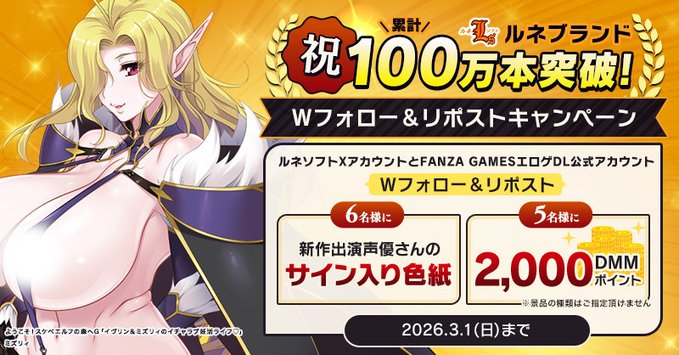 FANZA GAMES公式(ぬめ子)とルネソフト公式(ルネマン)の両方のXアカウントをフォローの上、該当のキャンペーンポストをリポストすると抽選で11名様にルネ新作に出演される声優さんの直筆サイン色紙や2000DMMポイントが貰えるWフォロー&リポストキャンペーンが開催中です!